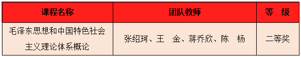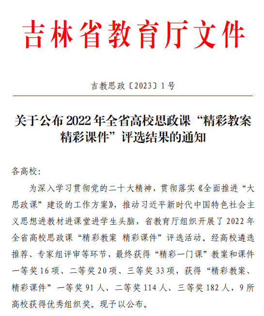 【JAI·赛】潜心耕耘,硕果飘香——马克思主义学院在全省高校思政课“精彩教案 精彩课件”比赛中喜获佳绩 发布时间:2023年01月13日 15:23:00 浏览:次 吉林省教育厅组织开展的2022年全省高校思政课“精彩教案 精彩课件”评选结果近日揭晓,新葡萄8883国际官网荣获团队及个人共计8个大奖: 其中王金老师的教案和课件获“精彩教案 精彩课件”类别一等奖;张绍珂、王金、蒋乔欣、陈杨组成团队的“毛泽东思想和中国特色社会主义理论体系概论”课获得“精彩一门课”类别二等奖;刘越、孙建峰、董金芳、张绍珂、朱浩、曹丽丽六位教师的教案和课件获得“精彩教案 精彩课件”三等奖。 一、“精彩一门课”获奖